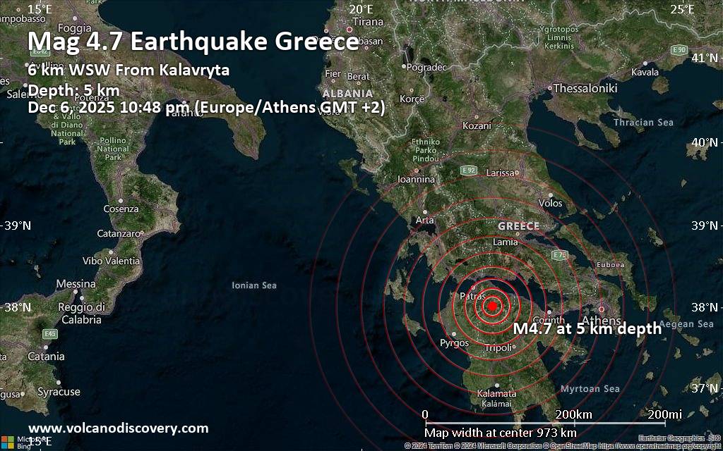 Magnitude 4.7 earthquake strikes near Pátrai, Achaea, West Greece, Greece A magnitude 4.7 earthquake near Pátrai, Achaea, West Greece, Greece, was reported only 12 minutes ago by the National Observatory of Athens (NOA), considered the main national agency that monitors seismic activity in Greece. The earthquake occurred at a very shallow depth of 5. km beneath the epicenter late at night on Saturday, December 6th, 2025, at 10:48 pm local time. The exact magnitude, epicenter, and depth of the quake might be revised within the next few hours or minutes as seismologists review data and refine their calculations, or as other agencies issue their report. A second report was later issued by the Kandilli Oservatory and Earthquake Research Institute in Istanbul (KOERI-RETMC), which listed it as a magnitude 4.7 earthquake as well. Other agencies reporting the same quake include the European-Mediterranean Seismological Centre (EMSC) at magnitude 4.9, the German Research Centre for Geosciences (GFZ) at magnitude 4.8, The Aristotle University of Thessaloniki Geophysical Lab. (AUTH) at magnitude 4.6, The Seismological Laboratory of the University of Athens (UOA) at magnitude 4.7, and the citizen-seismograph network of RaspberryShake at magnitude 4.8. Based on the preliminary seismic data, the quake should have been widely felt by almost everyone in the area of the epicenter. It might have caused light to moderate damage. Moderate shaking probably occurred in Kalavryta (pop. 1,600) located 6 km from the epicenter. In Diakopto (pop. 5,600) located 24 km from the epicenter, the quake should have been felt as light shaking. Weak shaking might have been felt in Aigio (pop. 20,400) located 26 km from the epicenter, Pátrai (pop. 168,000) 37 km away, Pyrgos (pop. 22,400) 65 km away, Amaliada (pop. 16,800) 65 km away, Argos (pop. 22,200) 74 km away, and Corinth (pop. 30,200) 80 km away. Other towns or cities near the epicenter where the quake might have been felt as very weak shaking include Agrinio (pop. 46,900) located 87 km from the epicenter. VolcanoDiscovery will automatically update magnitude and depth if these change and follow up if other significant news about the quake become available. If you’re in the area, please send us your experience through our reporting mechanism, either online or via our mobile app. This will help us provide more first-hand updates to anyone around the globe who wants to know more about this quake.