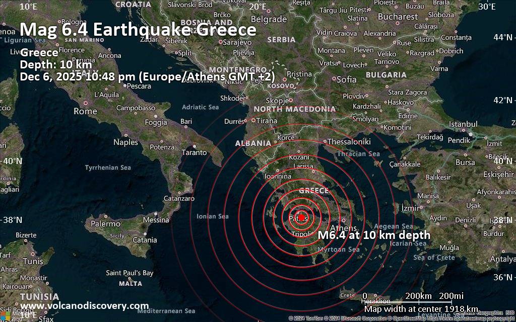 Earthquake data: Date & time: Dec 6, 2025 10:48 pm (Athens time) local time (6 Dec 2025 20:48 GMT)Magnitude: 6.4 Depth: 10.00 km Epicenter latitude / longitude: 38.08°N / 21.91°E  ( Dimos Erymanthos, West Greece, Greece) Primary data source: GFZhttps://www.volcanodiscovery.com/earthquake/news/288845/Magnitude-64-earthquake-strikes-near-Patrai-Achaea-West-Greece-Greece.html