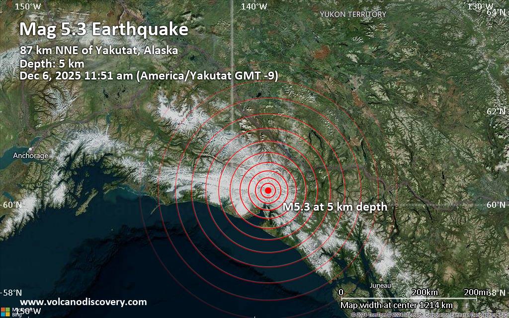 Earthquake data: Date & time: Dec 6, 2025 11:51 am (Yakutat time) local time (6 Dec 2025 20:51 GMT)Magnitude: 5.3 Depth: 5.00 km Epicenter latitude / longitude: 60.32°N / 139.4°W  ( Skagway Municipality, Alaska, United States) Primary data source: USGShttps://www.volcanodiscovery.com/earthquake/news/288838/Significant-magnitude-53-quake-hits-54-miles-north-of-Yakutat-Alaska-United-States-in-the-morning-.html