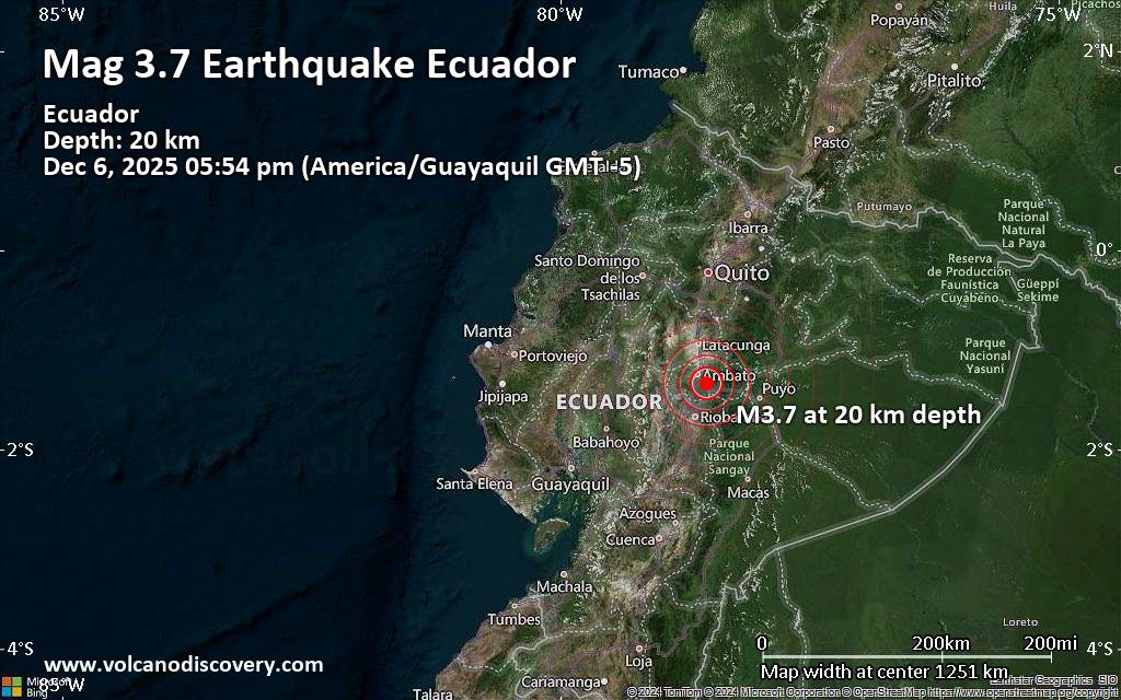 Small 3.7 quake hits near Ambato, Tungurahua, Ecuador A shallow magnitude 3.7 earthquake was reported in the afternoon near Ambato, Tungurahua, Ecuador. According to the European-Mediterranean Seismological Centre (EMSC), the quake hit on Saturday, December 6th, 2025, at 5:54 pm local time at a shallow depth of 20. km. Shallow earthquakes are felt more strongly than deeper ones as they are closer to the surface. The exact magnitude, epicenter, and depth of the quake might be revised within the next few hours or minutes as seismologists review data and refine their calculations, or as other agencies issue their report. Our monitoring service identified a second report from the Institute of Geophysics of the National Polytechnic School in Quito (IGEPN) which listed the quake at magnitude 3.9. Based on the preliminary seismic data, the quake should not have caused any significant damage, but was probably felt by many people as light vibration in the area of the epicenter. Weak shaking might have been felt in Pelileo (pop. 16,600) located 2 km from the epicenter. Other towns or cities near the epicenter where the quake might have been felt as very weak shaking include Ambato (pop. 387,300) located 13 km from the epicenter, Banos (pop. 9,500) 14 km away, Pillaro (pop. 7,500) 18 km away, San Miguel (pop. 10,800) 32 km away, Guano (pop. 12,700) 33 km away, and Pujili (pop. 16,200) 45 km away. In Machachi (pop. 25,700, 91 km away), the quake was probably not felt.