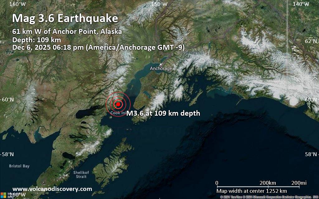 Earthquake data: Date & time: Dec 6, 2025 06:18 pm (Anchorage time) local time (7 Dec 2025 03:18 GMT)Magnitude: 3.6 Depth: 108.73 km Epicenter latitude / longitude: 59.83°N / 152.92°W  (Kenai Peninsula, Alaska, United States) Primary data source: USGShttps://www.volcanodiscovery.com/earthquake/news/288862/Small-magnitude-36-quake-hits-38-miles-west-of-Anchor-Point-Alaska-United-States-early-evening-.html