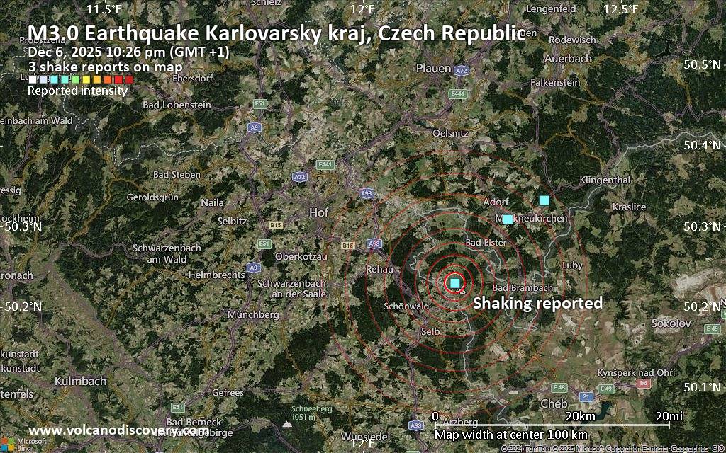 Earthquake data: Date & time: Dec 6, 2025 10:26 pm (GMT +1) local time (6 Dec 2025 21:26 GMT)Magnitude: unspecified Depth: unspecified Epicenter latitude / longitude: 50.23°N / 12.18°E  ( Karlovarsky kraj, Czechia) Primary data source: VolcanoDiscoveryhttps://www.volcanodiscovery.com/earthquake/news/288847/Seismic-like-event-possible-earthquake-reported-few-minutes-ago-near-Cheb-Karlovarsk-kraj-Czechia.html