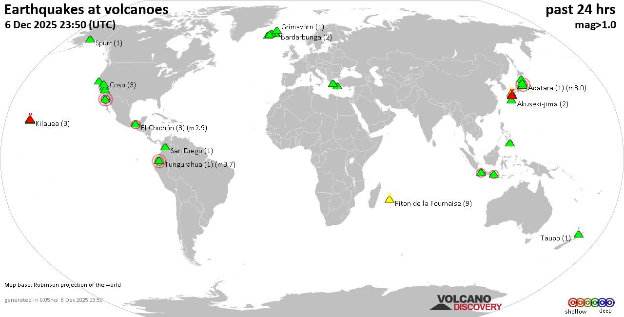 Volcano earthquake report for Saturday, 6 Dec 2025 World map showing volcanoes with shallow (less than 50 km) earthquakes within 20 km radius during the past 24 hours on 6 Dec 2025 Number in brackets indicate nr of quakes. Quakes detected near: Adatara (1 quake mag 3.0), Akita-Yake-yama (2 quakes between mag 0.5-1.2), Akuseki-jima (2 quakes between mag 1.4-1.8), Aso (22 quakes between mag 0.1-1.3), Bardarbunga (2 quakes between mag 0.8-1.2), Bratan (1 quake mag 2.3) Brennisteinsfjöll (2 quakes between mag 0.1-1.9), Clear Lake (39 quakes between mag 0.3-1.4), Coso (3 quakes between mag 0.8-1.4), El Chichón (3 quakes between mag 2.5-2.9), Eldey (3 quakes between mag 1.0-1.6), Grímsvötn (1 quake mag 1.2), Isla San Luis (1 quake mag 3.7), Kilauea (3 quakes between mag 1.7-1.8), Kirishima (10 quakes between mag 0.1-1.9), Kolumbo (4 quakes between mag 1.3-1.8), Lavic Lake (1 quake mag 1.0), Loihi (1 quake mag 1.9), Loki-Fögrufjöll volcano (7 quakes between mag 0.8-3.4), Mammoth Mountain (1 quake mag 1.6), Maunaloa (1 quake mag 1.8), Methana (1 quake mag 2.1), Nantai (24 quakes between mag 0.1-1.9), Nasu (1 quake mag 3.0), Papandayan (1 quake mag 2.5), Piton de la Fournaise (9 quakes between mag 0.3-1.4), Prestahnukur (1 quake mag 1.9), Ragang (1 quake mag 1.7), Sakurajima (2 quakes between mag 0.6-1.2), San Diego (1 quake mag 1.5), Sousaki (1 quake mag 1.5), Spurr (1 quake mag 1.3), Taupo (1 quake mag 1.5), Tjörnes Fracture Zone (1 quake mag 1.1), Tungurahua (1 quake mag 3.7), Zao (2 quakes between mag 0.7-3.0) (updated 23h50) Note: Earthquakes within 20 km from and at depths less than 50 km under active volcanoes are reported. The list is not complete because many volcanoes are not monitored and/or seismic data in high resolution is not available publicly.