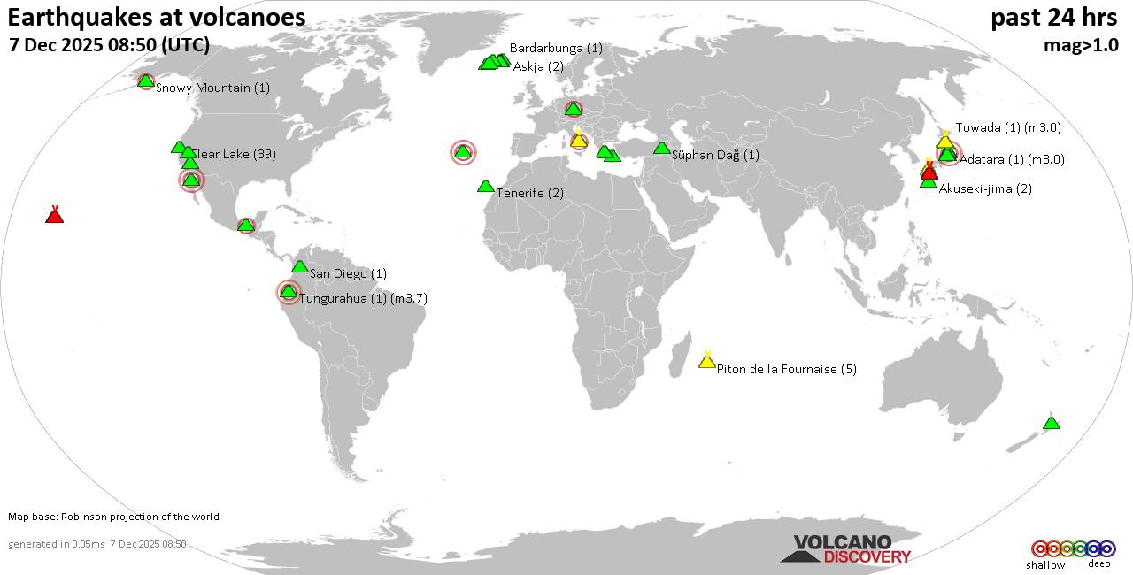 Volcano earthquake report for Sunday, 7 Dec 2025 World map showing volcanoes with shallow (less than 50 km) earthquakes within 20 km radius during the past 24 hours on 7 Dec 2025 Number in brackets indicate nr of quakes. Quakes detected near: Adatara (1 quake mag 3.0), Akita-Yake-yama (2 quakes between mag 0.5-1.2), Akuseki-jima (1 quake mag 1.4), Aso (25 quakes between mag 0.1-1.3), Bardarbunga (2 quakes between mag 0.8-1.2), Bratan (1 quake mag 2.3) Brennisteinsfjöll (2 quakes between mag 0.1-1.9), Cheb Basin volcanic area (1 quake mag 2.4), Clear Lake (38 quakes between mag 0.3-1.3), Coso (3 quakes between mag 0.8-1.4), El Chichón (6 quakes between mag 2.3-2.9), Eldey (2 quakes between mag 1.0-1.6), Grímsvötn (1 quake mag 1.2), Isla San Luis (1 quake mag 3.7), Kilauea (3 quakes between mag 1.7-2.4), Kirishima (14 quakes between mag 0.1-1.9), Kolumbo (4 quakes between mag 1.3-1.8), Lavic Lake (1 quake mag 1.0), Loihi (1 quake mag 1.9), Loki-Fögrufjöll volcano (7 quakes between mag 0.8-3.4), Mammoth Mountain (2 quakes between mag 1.3-1.6), Maunaloa (1 quake mag 1.8), Methana (1 quake mag 2.1), Nantai (24 quakes between mag 0.1-1.9), Papandayan (1 quake mag 2.5), Piton de la Fournaise (7 quakes between mag 0.3-1.4), Prestahnukur (1 quake mag 1.9), Sakurajima (3 quakes between mag 0.1-1.2), San Diego (1 quake mag 1.5), Sousaki (1 quake mag 1.5), Taupo (1 quake mag 1.5), Tenerife (2 quakes between mag 1.2-1.5), Tjörnes Fracture Zone (1 quake mag 1.1), Tungurahua (1 quake mag 3.7), Zao (1 quake mag 3.0) (updated 03h50) Note: Earthquakes within 20 km from and at depths less than 50 km under active volcanoes are reported. The list is not complete because many volcanoes are not monitored and/or seismic data in high resolution is not available publicly.