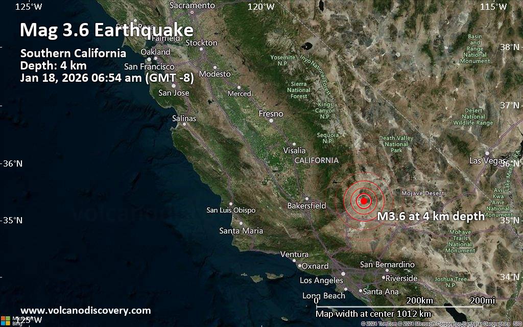 Small magnitude 3.6 quake hits 20 miles southwest of Ridgecrest, California, United States early morning A magnitude 3.6 earthquake near Ridgecrest, Kern County, California, USA, was reported only 3 minutes ago by the European-Mediterranean Seismological Centre (EMSC), considered one of the key international agencies that monitor seismic activity worldwide. The earthquake occurred at a very shallow depth of 2.4 miles beneath the epicenter early morning on Sunday, January 18th, 2026, at 6:54 am local time. The exact magnitude, epicenter, and depth of the quake might be revised within the next few hours or minutes as seismologists review data and refine their calculations, or as other agencies issue their report. Based on the preliminary seismic data, the quake should not have caused any significant damage, but was probably felt by many people as light vibration in the area of the epicenter. Weak shaking might have been felt in Randsburg (pop. 69) located 8 miles from the epicenter. Other towns or cities near the epicenter where the quake might have been felt as very weak shaking include California City (pop. 13,300) located 18 miles from the epicenter, and Ridgecrest (pop. 28,800) 20 miles away. In Rosamond (pop. 18,200, 39 miles away), Lancaster (pop. 161,100, 49 miles away), Barstow Heights (pop. 24,200, 53 miles away), and Palmdale (pop. 158,400, 56 miles away), the quake was probably not felt.