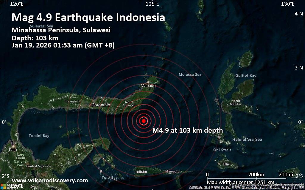 Earthquake data: Date & time: Jan 19, 2026 01:53 am (GMT +8) local time (18 Jan 2026 17:53 GMT)Magnitude: 4.9 Depth: 103.00 km Epicenter latitude / longitude: 0.04°N / 124.68°E  ( Sulawesi Utara, Indonesia) Primary data source: BMKGhttps://www.volcanodiscovery.com/earthquake/news/292270/Moderate-magnitude-49-quake-hits-53-km-southeast-of-Modisi-Indonesia-early-morning-.html