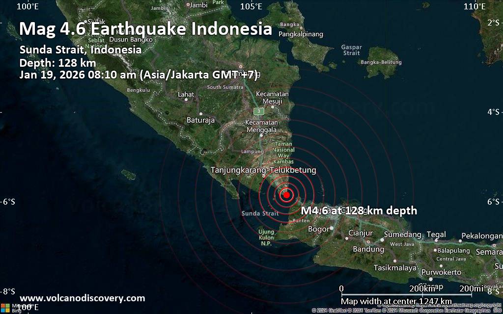 Moderate 4.6 quake hits near Cilegon, Kota Cilegon, Banten, Indonesia An earthquake of magnitude 4.6 occurred only 7 minutes ago 34 km northwest of Cilegon, Indonesia, Indonesia's Meteorology, Climatology, and Geophysical Agency reported. The quake hit at an intermediate depth of 128. km beneath the epicenter near Cilegon, Kota Cilegon, Banten, Indonesia, in the morning on Monday, January 19th, 2026, at 8:10 am local time. The exact magnitude, epicenter, and depth of the quake might be revised within the next few hours or minutes as seismologists review data and refine their calculations, or as other agencies issue their report. Our monitoring service identified a second report from the citizen-seismograph network of RaspberryShake which listed the quake at magnitude 4.6 as well. Towns or cities near the epicenter where the quake might have been felt as very weak shaking include Cilegon (pop. 450,300) located 34 km from the epicenter, Pandeglang (pop. 92,300) 62 km away, Kresek (pop. 110,200) 72 km away, Bandar Lampung (pop. 1,166,100) 75 km away, Rangkasbitung (pop. 137,000) 76 km away, Pasarkemis (pop. 273,700) 89 km away, Cikupa (pop. 174,000) 90 km away, and Metro (pop. 178,400) 98 km away. VolcanoDiscovery will automatically update magnitude and depth if these change and follow up if other significant news about the quake become available. If you’re in the area, please send us your experience through our reporting mechanism, either online or via our mobile app. This will help us provide more first-hand updates to anyone around the globe who wants to know more about this quake.
