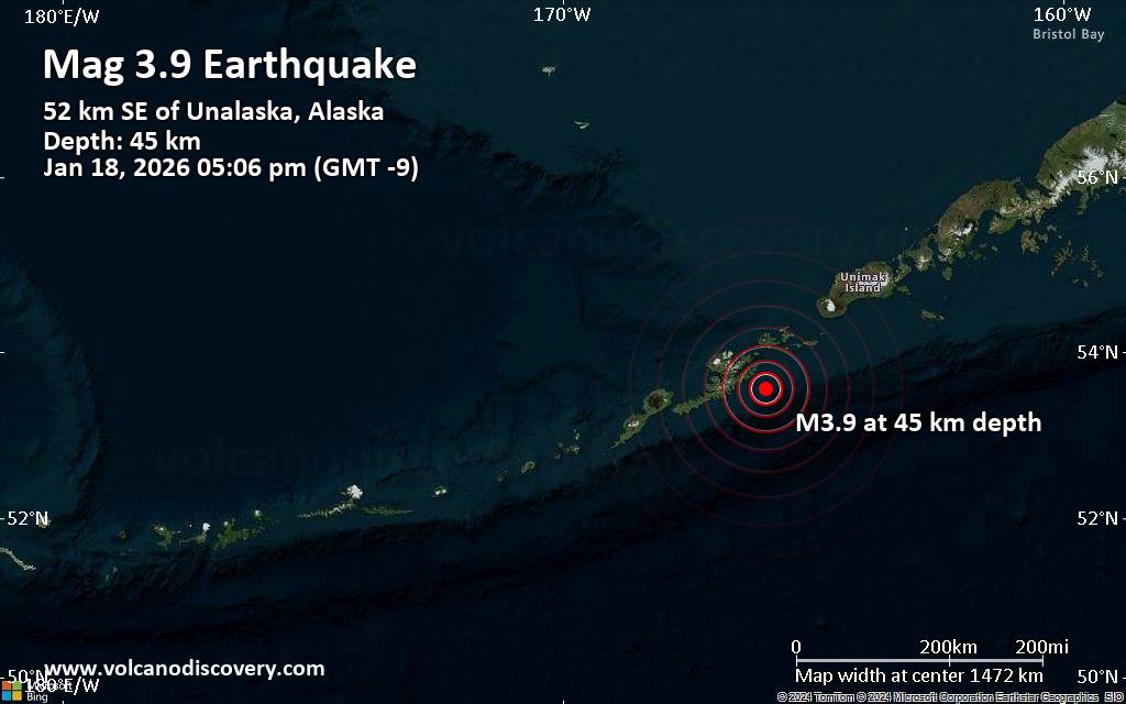 Earthquake data: Date & time: Jan 19, 2026 02:06 am (Universal Time) local time (19 Jan 2026 02:06 GMT)Magnitude: 3.9 Depth: 44.86 km Epicenter latitude / longitude: 53.56°N / 165.94°W  (Aleutians West, Alaska, United States) Primary data source: USGShttps://www.volcanodiscovery.com/earthquake/news/292297/Small-magnitude-39-earthquake-32-miles-southeast-of-Unalaska-Alaska-United-States.html