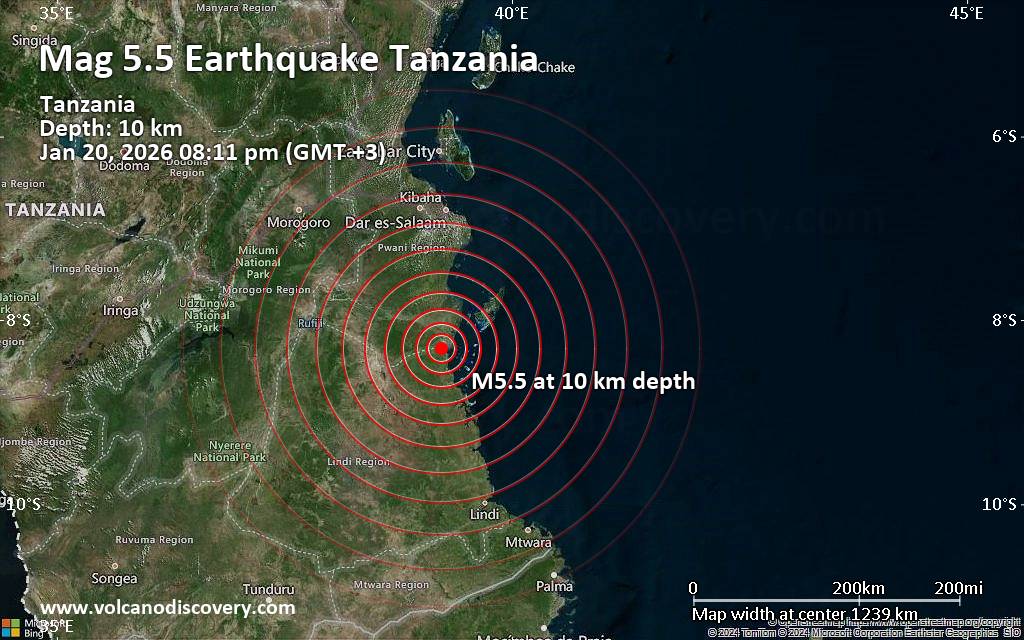 Earthquake data: Date & time: Jan 20, 2026 08:11 pm (Dar es Salaam time) local time (20 Jan 2026 17:11 GMT)Magnitude: 5.5 Depth: 10.00 km Epicenter latitude / longitude: 8.31°S / 39.23°E  ( Lindi Region, Tanzania) Primary data source: EMSChttps://www.volcanodiscovery.com/earthquake/news/292449/Magnitude-55-earthquake-strikes-near-Ikwiriri-Rufiji-District-Coast-Region-Tanzania.html