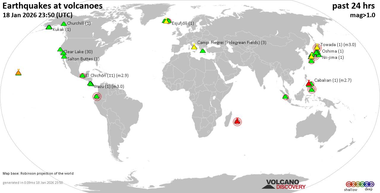Volcano earthquake report for Sunday, 18 Jan 2026 World map showing volcanoes with shallow (less than 50 km) earthquakes within 20 km radius during the past 24 hours on 18 Jan 2026 Number in brackets indicate nr of quakes. Quakes detected near: Abu (23 quakes between mag 0.1-1.2), Akuseki-jima (1 quake mag 2.1), Arenal (1 quake mag 1.9), Aso (5 quakes between mag 0.2-1.0), Balut (1 quake mag 3.0), Bardarbunga (2 quakes between mag 0.7-1.5) Cabalian (1 quake mag 2.7), Campi Flegrei (Phlegrean Fields) (3 quakes between mag 0.1-1.4), Canlaon (1 quake mag 1.8), Churchill (1 quake mag 1.2), Clear Lake (30 quakes between mag 0.2-1.3), Coso (9 quakes between mag 0.5-1.5), Cuernos de Negros (1 quake mag 3.0), El Chichón (11 quakes between mag 2.2-2.9), Esjufjöll (1 quake mag 2.0), Guagua Pichincha (1 quake mag 3.0), Hiuchi (2 quakes between mag 0.1-1.3), Hrómundartindur (2 quakes between mag 0.8-1.1), Irazu (1 quake mag 3.0), Katla (1 quake mag 1.5), Katmai (2 quakes between mag 0.7-1.3), Kilauea (5 quakes between mag 1.7-1.9), Kukak (1 quake mag 1.1), Loihi (2 quakes between mag 1.7-2.2), Miravalles (1 quake mag 2.5), Myoko (31 quakes between mag 0.1-2.1), Nii-jima (1 quake mag 1.2), Norikura (10 quakes between mag 0.2-1.1), Novarupta (7 quakes between mag 0.6-1.2), Oshima (1 quake mag 1.0), Piton de la Fournaise (41 quakes between mag 0.0-3.3), Salton Buttes (1 quake mag 1.0), Sanbe (1 quake mag 3.0), Snowy Mountain (4 quakes between mag 0.9-2.3), Sousaki (1 quake mag 1.7), Tandikat (1 quake mag 2.1), Tenorio (1 quake mag 3.0), To-shima (1 quake mag 1.5), Torfajökull (2 quakes between mag 1.5-1.7), Towada (1 quake mag 3.0), Unzen (1 quake mag 1.1), Washiba-Kumonotaira (39 quakes between mag 0.1-1.9) (updated 23h50) Note: Earthquakes within 20 km from and at depths less than 50 km under active volcanoes are reported. The list is not complete because many volcanoes are not monitored and/or seismic data in high resolution is not available publicly.