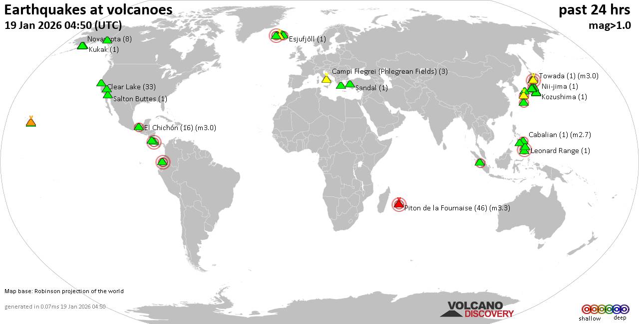 Volcano earthquake report for Monday, 19 Jan 2026 World map showing volcanoes with shallow (less than 50 km) earthquakes within 20 km radius during the past 24 hours on 19 Jan 2026 Number in brackets indicate nr of quakes. Quakes detected near: Abu (25 quakes between mag 0.1-1.2), Akuseki-jima (1 quake mag 2.1), Arenal (1 quake mag 1.9), Aso (6 quakes between mag 0.2-3.2), Balut (1 quake mag 3.0), Bardarbunga (2 quakes between mag 0.7-1.5) Brennisteinsfjöll (1 quake mag 3.0), Cabalian (1 quake mag 2.7), Campi Flegrei (Phlegrean Fields) (3 quakes between mag 0.1-1.4), Churchill (1 quake mag 1.2), Clear Lake (30 quakes between mag 0.2-1.3), Coso (8 quakes between mag 0.7-1.5), Cuernos de Negros (1 quake mag 3.0), El Chichón (10 quakes between mag 2.2-2.9), Esjufjöll (1 quake mag 2.0), Guagua Pichincha (1 quake mag 3.0), Hiuchi (5 quakes between mag 0.1-1.4), Hrómundartindur (2 quakes between mag 0.8-1.1), Irazu (1 quake mag 3.0), Katla (1 quake mag 1.5), Katmai (2 quakes between mag 0.7-1.3), Kilauea (6 quakes between mag 1.7-1.9), Kukak (1 quake mag 1.1), Leonard Range (1 quake mag 1.8), Loihi (2 quakes between mag 1.7-2.2), Miravalles (1 quake mag 2.5), Myoko (39 quakes between mag 0.1-2.1), Nii-jima (1 quake mag 1.2), Norikura (7 quakes between mag 0.2-1.1), Novarupta (8 quakes between mag 0.6-1.2), Oshima (1 quake mag 1.0), Piton de la Fournaise (44 quakes between mag 0.0-3.3), Salton Buttes (1 quake mag 1.0), Sanbe (1 quake mag 3.0), Sandal (1 quake mag 1.3), Snowy Mountain (4 quakes between mag 0.9-2.3), Sousaki (1 quake mag 1.7), Tandikat (1 quake mag 2.1), Tenorio (1 quake mag 3.0), To-shima (1 quake mag 1.5), Torfajökull (2 quakes between mag 1.5-1.7), Towada (1 quake mag 3.0), Washiba-Kumonotaira (35 quakes between mag 0.1-1.9) (updated 01h50) Note: Earthquakes within 20 km from and at depths less than 50 km under active volcanoes are reported. The list is not complete because many volcanoes are not monitored and/or seismic data in high resolution is not available publicly.