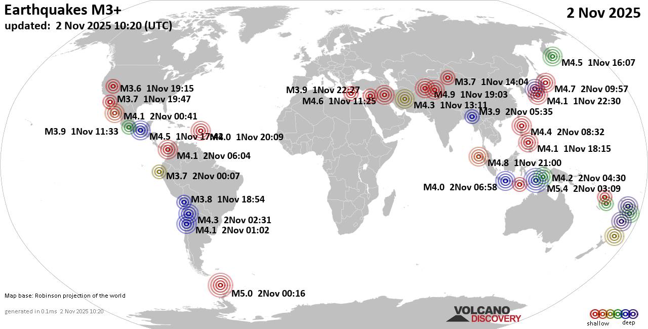Note: Earthquakes within 20 km from and at depths less than 50 km under active volcanoes are reported. The list is not complete because many volcanoes are not monitored and/or seismic data in high resolution is not available publicly.