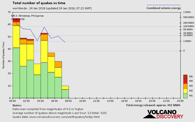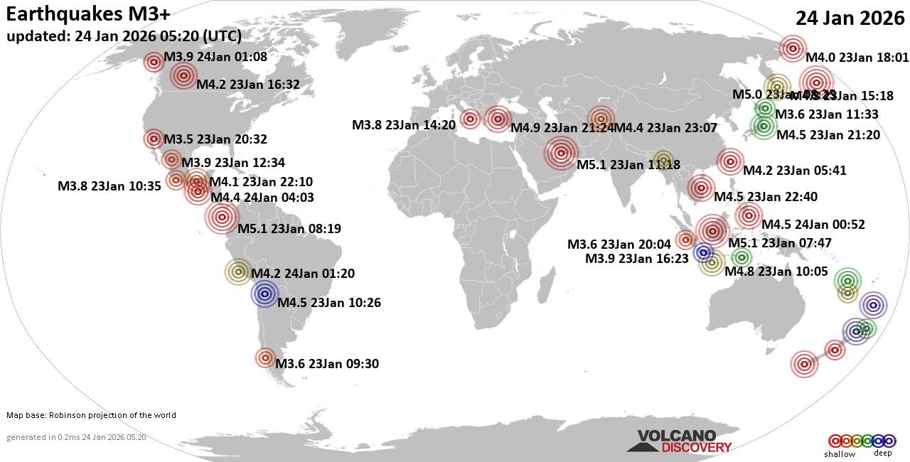 World Earthquake Report for Saturday, 24 January 2026 Worldwide earthquakes above magnitude 3 during the past 24 hours on 24 Jan 2026 Summary: 4 quakes 5.0+, 28 quakes 4.0+, 156 quakes 3.0+, 375 quakes 2.0+ (563 total)This report is being updated every hour.Magnitude 5+: 4 earthquakes Magnitude 4+: 28 earthquakes Magnitude 3+: 156 earthquakes Magnitude 2+: 375 earthquakes No quakes of magnitude 6 or higher 10 largest earthquakes in the world (past 24 hours)Friday, Jan 23, 2026, at 03:19 am (GMT -5) - Friday, Jan 23, 2026, at 02:47 pm (Pontianak time) - Friday, Jan 23, 2026, at 02:48 pm (Tehran time) - Thursday, Jan 22, 2026, at 10:25 pm (GMT -10) - Saturday, Jan 24, 2026, at 12:24 am (GMT +3) - Friday, Jan 23, 2026, at 05:05 pm (GMT +7) - Saturday, Jan 24, 2026, at 05:40 am (GMT +7) - Saturday, Jan 24, 2026, at 01:07 am (GMT +13) - Saturday, Jan 24, 2026, at 08:52 am (GMT +8) - Saturday, Jan 24, 2026, at 07:30 am (GMT +8) - Earthquakes reported feltSaturday, Jan 24, 2026, at 12:24 am (GMT +3) - Friday, Jan 23, 2026, at 03:20 pm (GMT +1) - Friday, Jan 23, 2026, at 10:00 am (GMT -7) - Saturday, Jan 24, 2026, at 12:28 am (Istanbul time) - Friday, Jan 23, 2026, at 02:47 pm (Pontianak time) - Friday, Jan 23, 2026, at 08:46 pm (GMT +10) - Friday, Jan 23, 2026, at 12:25 pm (GMT -3) - Saturday, Jan 24, 2026, at 06:20 am (GMT +9) - Friday, Jan 23, 2026, at 02:48 pm (Tehran time) - Friday, Jan 23, 2026, at 03:45 pm (Istanbul time) - Friday, Jan 23, 2026, at 08:04 pm (GMT +5:30) - Friday, Jan 23, 2026, at 05:05 pm (GMT +7) - Friday, Jan 23, 2026, at 03:19 am (GMT -5) - Friday, Jan 23, 2026, at 07:10 am (GMT -6) - Saturday, Jan 24, 2026, at 12:33 am (GMT +3) - Earthquake stats  https://www.volcanodiscovery.com/earthquake/news/292788/World-Earthquake-Report-for-Saturday-24-January-2026.html