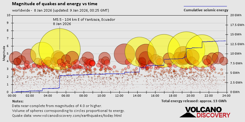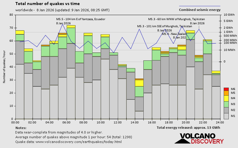 World Earthquake Report for Thursday, 8 January 2026 Worldwide earthquakes above magnitude 3 during the past 24 hours on 8 Jan 2026 Summary: 5 quakes 5.0+, 36 quakes 4.0+, 160 quakes 3.0+, 435 quakes 2.0+ (636 total)This report is being updated every hour.Magnitude 5+: 5 earthquakes Magnitude 4+: 36 earthquakes Magnitude 3+: 160 earthquakes Magnitude 2+: 435 earthquakes No quakes of magnitude 6 or higher 10 largest earthquakes in the world (past 24 hours)Thursday, Jan 8, 2026, at 11:00 am (GMT +13) - Thursday, Jan 8, 2026, at 12:17 am (Lima time) - Thursday, Jan 8, 2026, at 10:00 pm (Dushanbe time) - Thursday, Jan 8, 2026, at 11:14 am (San Juan time) - Thursday, Jan 8, 2026, at 01:21 pm (Port Moresby time) - Thursday, Jan 8, 2026, at 11:57 pm (Jayapura time) - Thursday, Jan 8, 2026, at 11:33 pm (GMT +11) - Thursday, Jan 8, 2026, at 08:08 am (Guadalcanal time) - Thursday, Jan 8, 2026, at 03:57 am (Jayapura time) - Thursday, Jan 8, 2026, at 02:50 am (GMT +1) - Earthquakes reported feltThursday, Jan 8, 2026, at 06:32 pm (GMT +1) - Thursday, Jan 8, 2026, at 12:17 am (Lima time) - Thursday, Jan 8, 2026, at 09:26 pm (Yangon time) - Thursday, Jan 8, 2026, at 06:30 pm (Kolkata time) - Thursday, Jan 8, 2026, at 12:00 am (Los Angeles time) - Thursday, Jan 8, 2026, at 11:14 am (San Juan time) - Thursday, Jan 8, 2026, at 01:25 pm (GMT +2) - Wednesday, Jan 7, 2026, at 03:56 pm (GMT -8) - Thursday, Jan 8, 2026, at 06:53 pm (GMT +1) - Thursday, Jan 8, 2026, at 02:31 am (GMT +1) - Thursday, Jan 8, 2026, at 10:00 pm (Dushanbe time) - Thursday, Jan 8, 2026, at 10:01 am (GMT -6) - Thursday, Jan 8, 2026, at 12:00 am (GMT -8) - Wednesday, Jan 7, 2026, at 03:32 pm (Santo Domingo time) - Thursday, Jan 8, 2026, at 02:50 am (GMT +1) - Friday, Jan 9, 2026, at 12:30 am (Taipei time) - Thursday, Jan 8, 2026, at 01:06 am (GMT -4) - Wednesday, Jan 7, 2026, at 11:57 pm (GMT +1) - Earthquake stats  https://www.volcanodiscovery.com/earthquake/news/291346/World-Earthquake-Report-for-Thursday-8-January-2026.html