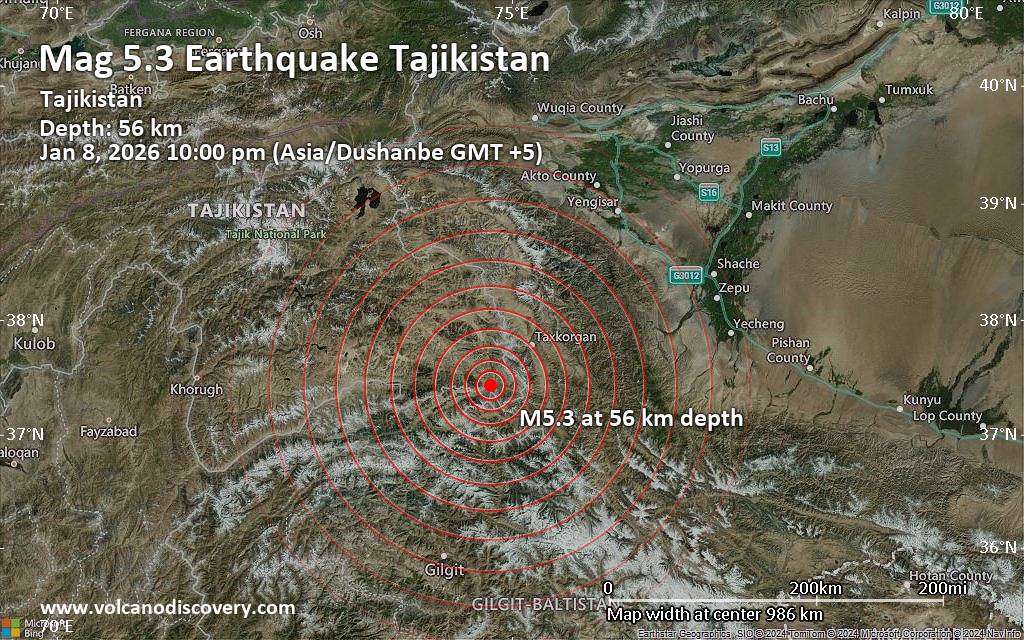 Significant 5.3 quake hits near Murghab, Gorno-Badakhshan, Tajikistan A moderately shallow magnitude 5.3 earthquake was reported late at night near Murghab, Gorno-Badakhshan, Tajikistan. According to the European-Mediterranean Seismological Centre (EMSC), the quake hit on Thursday, January 8th, 2026, at 10:00 pm local time at a moderately shallow depth of 56. km. The exact magnitude, epicenter, and depth of the quake might be revised within the next few hours or minutes as seismologists review data and refine their calculations, or as other agencies issue their report. Our monitoring service identified a second report from the citizen-seismograph network of RaspberryShake which listed the quake at magnitude 5.3 as well. Other agencies reporting the same quake include France's Réseau National de Surveillance Sismique (RéNaSS) at magnitude 5.2, and the German Research Centre for Geosciences (GFZ) at magnitude 5.3. Generally quakes of this magnitude are recorded by more than one agency and the results can vary, with subsequent reports that come in after the first one often showing more accuracy. Based on the preliminary seismic data, the quake should not have caused any significant damage, but was probably felt by many people as light vibration in the area of the epicenter. Weak shaking might have been felt in Murghab (pop. 10,800) located 108 km from the epicenter. VolcanoDiscovery will automatically update magnitude and depth if these change and follow up if other significant news about the quake become available. If you’re in the area, please send us your experience through our reporting mechanism, either online or via our mobile app. This will help us provide more first-hand updates to anyone around the globe who wants to know more about this quake.