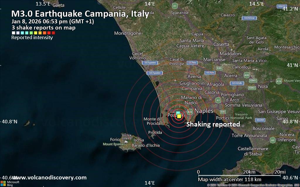 Earthquake data: Date & time: Jan 8, 2026 06:53 pm (GMT +1) local time (8 Jan 2026 17:53 GMT)Magnitude: unspecified Depth: unspecified Epicenter latitude / longitude: 40.82°N / 14.14°E  ( Campania, Italy) Primary data source: VolcanoDiscoveryhttps://www.volcanodiscovery.com/earthquake/news/291430/Seismic-like-event-possible-earthquake-reported-few-minutes-ago-near-Naples-Campania-Italy.html
