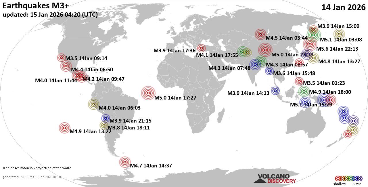 Volcano earthquake report for Thursday, 15 Jan 2026 World map showing volcanoes with shallow (less than 50 km) earthquakes within 20 km radius during the past 24 hours on 15 Jan 2026 Number in brackets indicate nr of quakes. Quakes detected near: Abu (22 quakes between mag 0.3-1.0), Akuseki-jima (2 quakes between mag 1.1-1.7), Bardarbunga (4 quakes between mag 0.5-1.4), Campi Flegrei (Phlegrean Fields) (18 quakes between mag 0.1-2.5), Canlaon (10 quakes between mag 1.1-2.8), Cerro Bravo (1 quake mag 1.6) Clear Lake (28 quakes between mag 0.2-1.5), Eldey (1 quake mag 1.7), Fourpeaked (1 quake mag 1.8), Fuego (1 quake mag 4.0), Geureudong (1 quake mag 2.7), Gilbanta (1 quake mag 2.1), Gran Canaria (1 quake mag 1.3), Hrómundartindur (2 quakes between mag 0.9-1.1), Ilopango (1 quake mag 3.0), Jan Mayen (1 quake mag 2.0), Kaguyak (1 quake mag 1.4), Katla (4 quakes between mag 0.8-1.8), Katmai (1 quake mag 1.0), Kilauea (13 quakes between mag 0.9-1.9), Kolumbo (1 quake mag 2.0), Koruhüyüğü (1 quake mag 1.4), Krísuvík (5 quakes between mag 0.3-1.7), Kuchinoshima (1 quake mag 1.4), Ljósufjöll (3 quakes between mag 0.6-1.0), Lokbatan (1 quake mag 3.0), Machin (2 quakes between mag 1.1-3.0), Martin (1 quake mag 1.7), Methana (2 quakes between mag 1.1-1.3), Nejapa-Miraflores (1 quake mag 1.8), Norikura (2 quakes between mag 0.8-2.1), Olot Field (1 quake mag 1.4), Pavlof (5 quakes between mag 0.0-1.0), Pavlof Sister (7 quakes between mag 0.0-1.0), Platanar (1 quake mag 1.8), Salton Buttes (1 quake mag 1.2), Santa Isabel (2 quakes between mag 0.0-1.0), Santorini (2 quakes between mag 1.1-3.2), Sousaki (3 quakes between mag 1.1-2.2), Taranaki (1 quake mag 2.0), Theistareykjarbunga (1 quake mag 1.1) (updated 02h50) Note: Earthquakes within 20 km from and at depths less than 50 km under active volcanoes are reported. The list is not complete because many volcanoes are not monitored and/or seismic data in high resolution is not available publicly.