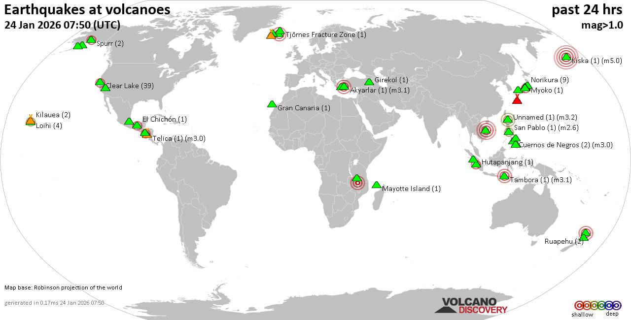Volcano earthquake report for Saturday, 24 Jan 2026 World map showing volcanoes with shallow (less than 50 km) earthquakes within 20 km radius during the past 24 hours on 24 Jan 2026 Number in brackets indicate nr of quakes. Quakes detected near: Akyarlar (1 quake mag 3.1), Auckland Field (1 quake mag 3.0), Bardarbunga (3 quakes between mag 1.3-3.0), Clear Lake (42 quakes between mag 0.2-2.4), Colima (1 quake mag 3.1), Coso (3 quakes between mag 0.6-1.1) Cuernos de Negros (2 quakes between mag 1.7-3.0), El Chichón (1 quake mag 2.2), Eldey (3 quakes between mag 1.4-1.9), Girekol (1 quake mag 1.4), Gran Canaria (2 quakes between mag 1.4-1.6), Kalatungan (1 quake mag 1.7), Kilauea (1 quake mag 1.7), Kiska (1 quake mag 5.0), Kolumbo (2 quakes between mag 1.1-1.4), Kukak (1 quake mag 1.2), Kyejo (1 quake mag 3.0), La Malinche (1 quake mag 3.0), Laguna Aramuaca (3 quakes between mag 2.2-3.3), Ljósufjöll (2 quakes between mag 1.0-1.1), Loihi (3 quakes between mag 1.7-1.8), Mahagnao (1 quake mag 1.5), Mayotte Island (1 quake mag 1.1), Methana (1 quake mag 2.1), Myoko (1 quake mag 1.2), Norikura (10 quakes between mag 0.1-2.0), Numazawa (1 quake mag 1.1), Ragang (1 quake mag 3.1), Ruapehu (2 quakes between mag 1.1-1.2), Salton Buttes (1 quake mag 1.6), San Pablo (1 quake mag 2.6), Sanbe (1 quake mag 1.2), Spurr (1 quake mag 1.8), Suwanose-jima (1 quake mag 1.6), Talakmau (1 quake mag 2.4), Tambora (1 quake mag 3.1), Telica (1 quake mag 3.0), Tenerife (2 quakes between mag 0.8-1.4), Tjörnes Fracture Zone (1 quake mag 1.0), Toroeng Prong (1 quake mag 4.5), Ukinrek Maars (1 quake mag 1.5), Washiba-Kumonotaira (5 quakes between mag 0.4-1.1), Yake-dake (2 quakes between mag 0.1-1.0) (updated 04h50) Note: Earthquakes within 20 km from and at depths less than 50 km under active volcanoes are reported. The list is not complete because many volcanoes are not monitored and/or seismic data in high resolution is not available publicly.